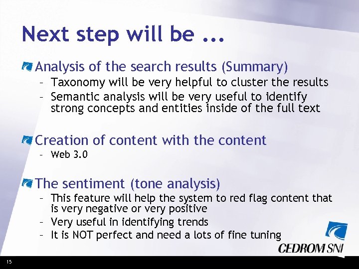 Next step will be. . . Analysis of the search results (Summary) – Taxonomy will be very helpful to cluster the results – Semantic analysis will be very useful to identify strong concepts and entities inside of the full text Creation of content with the content – Web 3. 0 The sentiment (tone analysis) – This feature will help the system to red flag content that is very negative or very positive – Very useful in identifying trends – It is NOT perfect and need a lots of fine tuning 15