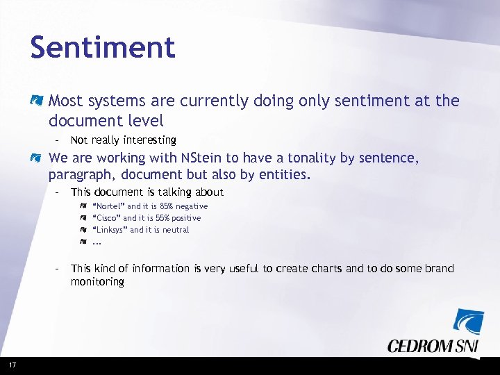 Sentiment Most systems are currently doing only sentiment at the document level – Not really interesting We are working with NStein to have a tonality by sentence, paragraph, document but also by entities. – This document is talking about “Nortel” and it is 85% negative “Cisco” and it is 55% positive “Linksys” and it is neutral. . . – This kind of information is very useful to create charts and to do some brand monitoring 17