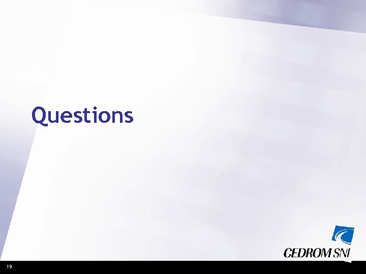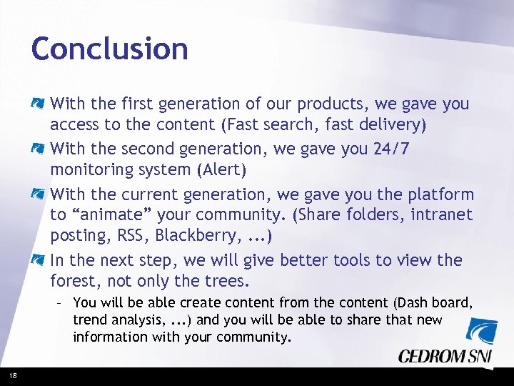 Conclusion With the first generation of our products, we gave you access to the content (Fast search, fast delivery) With the second generation, we gave you 24/7 monitoring system (Alert) With the current generation, we gave you the platform to “animate” your community. (Share folders, intranet posting, RSS, Blackberry, . . . ) In the next step, we will give better tools to view the forest, not only the trees. – You will be able create content from the content (Dash board, trend analysis, . . . ) and you will be able to share that new information with your community. 18