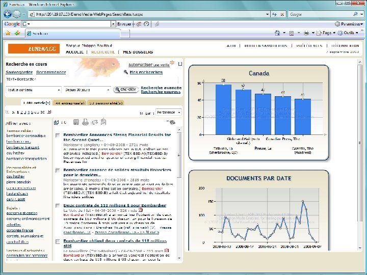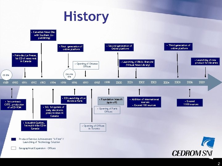 History • Canadian News Disc with Southam (copublishing) • Third generation of • Second generation of • First generation of online platform Online platform online platform • Périodisc La Presse, 1 st CD of news-reel in Canada product for libraries (Virtual News Library) Offices On-Line Era CD Era 1989 • Launching of new • Launching of Biblio-Branché • Opening of Ottawa 1990 1991 1992 1993 1994 1995 1996 1997 • CD Launching of Le Monde à Paris • 1 st contract: CRTC, production of a CD-ROM • SI 3, 1 st system of daily electronic press reviews in Canada 1998 1999 2000 • Foundation Ixiasoft (spin-off) 2001 2002 2003 • Addition of international sources • Exceed 100 sources 2004 2005 2006 2007. . . • Exceed 1 000 sources • Opening of Paris Offices • Actualité Québec, 1 st multi-title CD in Canada • Opening of Offices in Toronto Product/Service Achievement “A First”/ Launching of Technology Solution Geographical Expansion - Offices 2