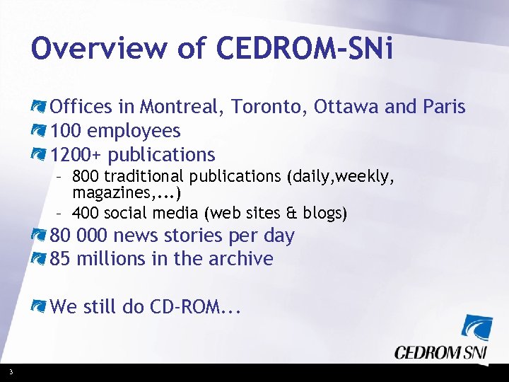 Overview of CEDROM-SNi Offices in Montreal, Toronto, Ottawa and Paris 100 employees 1200+ publications – 800 traditional publications (daily, weekly, magazines, . . . ) – 400 social media (web sites & blogs) 80 000 news stories per day 85 millions in the archive We still do CD-ROM. . . 3