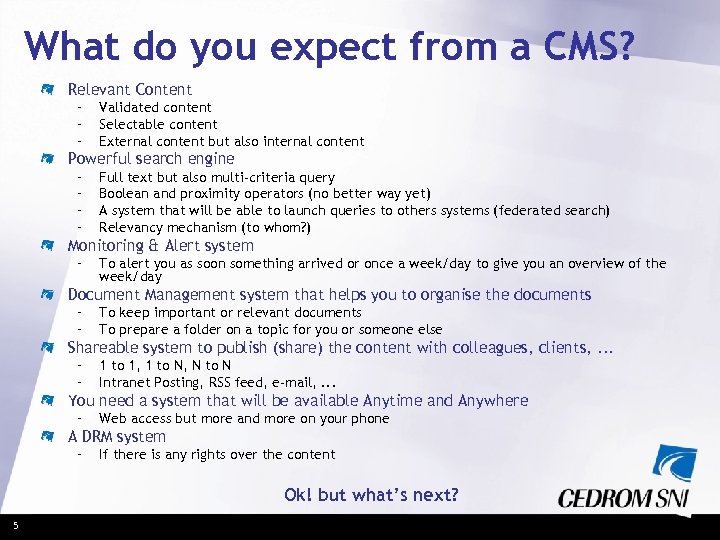 What do you expect from a CMS? Relevant Content – – – Validated content Selectable content External content but also internal content Powerful search engine – – Full text but also multi-criteria query Boolean and proximity operators (no better way yet) A system that will be able to launch queries to others systems (federated search) Relevancy mechanism (to whom? ) Monitoring & Alert system – To alert you as soon something arrived or once a week/day to give you an overview of the week/day Document Management system that helps you to organise the documents – – To keep important or relevant documents To prepare a folder on a topic for you or someone else Shareable system to publish (share) the content with colleagues, clients, . . . – – 1 to 1, 1 to N, N to N Intranet Posting, RSS feed, e-mail, . . . You need a system that will be available Anytime and Anywhere – Web access but more and more on your phone A DRM system – If there is any rights over the content Ok! but what’s next? 5
