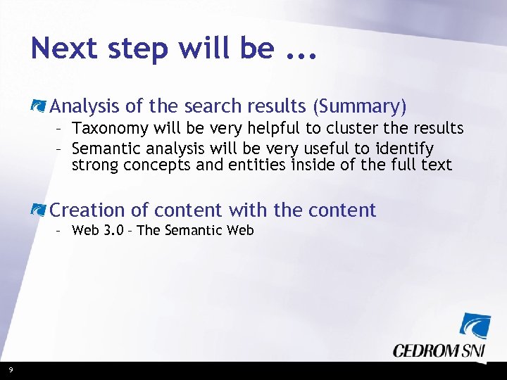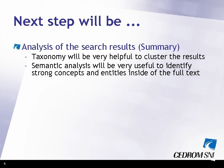 Next step will be. . . Analysis of the search results (Summary) – Taxonomy will be very helpful to cluster the results – Semantic analysis will be very useful to identify strong concepts and entities inside of the full text 6