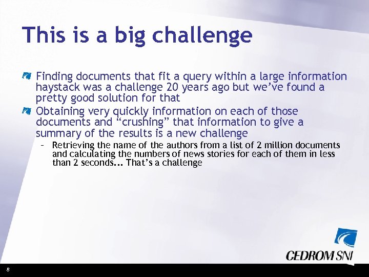 This is a big challenge Finding documents that fit a query within a large information haystack was a challenge 20 years ago but we’ve found a pretty good solution for that Obtaining very quickly information on each of those documents and “crushing” that information to give a summary of the results is a new challenge – Retrieving the name of the authors from a list of 2 million documents and calculating the numbers of news stories for each of them in less than 2 seconds. . . That’s a challenge 8