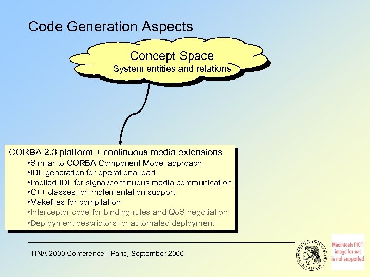 Code Generation Aspects Concept Space System entities and relations CORBA 2. 3 platform + continuous media extensions • Similar to CORBA Component Model approach • IDL generation for operational part • Implied IDL for signal/continuous media communication • C++ classes for implementation support • Makefiles for compilation • Interceptor code for binding rules and Qo. S negotiation • Deployment descriptors for automated deployment TINA 2000 Conference - Paris, September 2000
