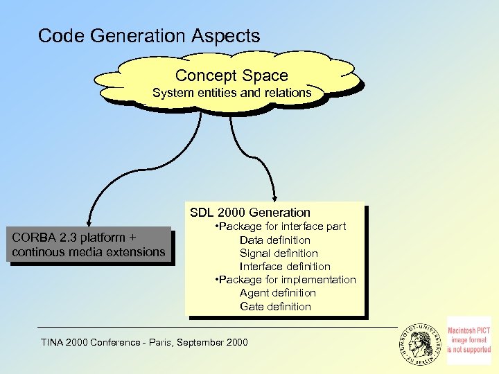 Code Generation Aspects Concept Space System entities and relations CORBA 2. 3 platform + continous media extensions SDL 2000 Generation TINA 2000 Conference - Paris, September 2000 Planned Environments • CORBA Components Platform • Quality Aware Middleware (QAM, KPN Research) • . . .