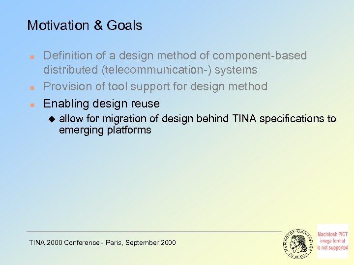 Motivation & Goals n n n Definition of a design method of component-based distributed (telecommunication-) systems Provision of tool support for design method Enabling design reuse u allow for migration of design behind TINA specifications to emerging platforms TINA 2000 Conference - Paris, September 2000