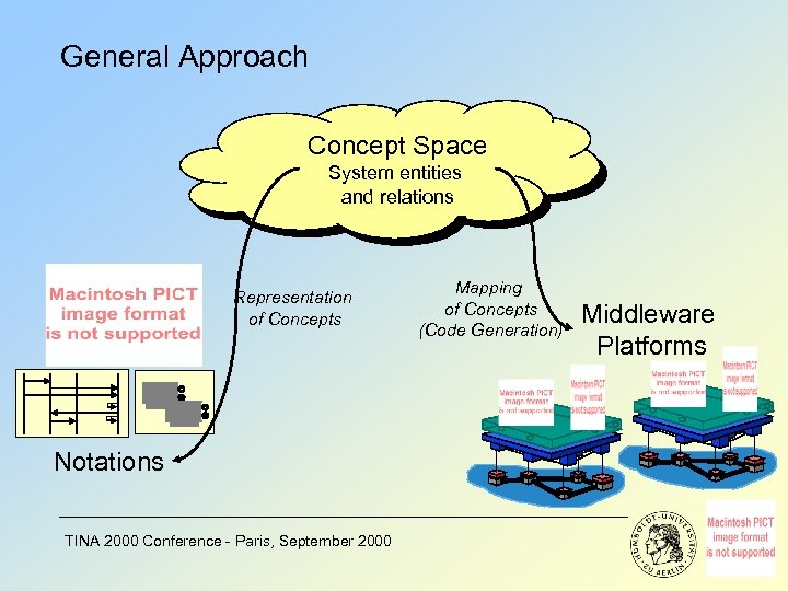 General Approach Concept Space System entities and relations Representation of Concepts Notations TINA 2000 Conference - Paris, September 2000 Mapping of Concepts (Code Generation) Middleware Platforms