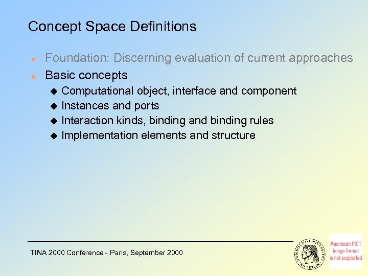 Concept Space Definitions n n Foundation: Discerning evaluation of current approaches Basic concepts Computational object, interface and component u Instances and ports u Interaction kinds, binding and binding rules u Implementation elements and structure u TINA 2000 Conference - Paris, September 2000