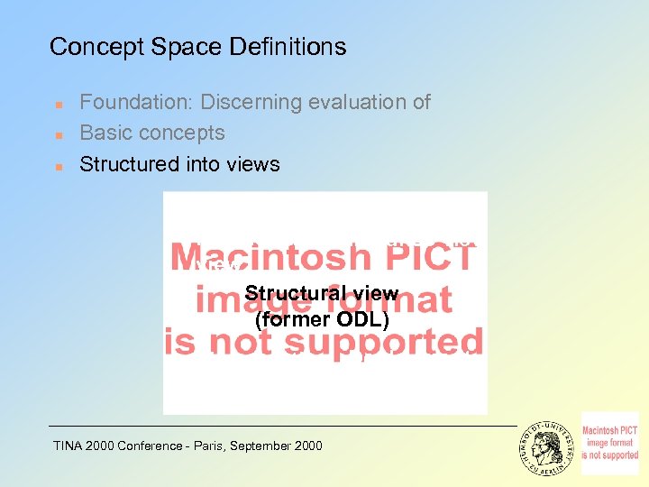 Concept Space Definitions n n n Foundation: Discerning evaluation of Basic concepts Structured into views Interaction Instance view Structural view (former ODL) Implementation Deployment view TINA 2000 Conference - Paris, September 2000