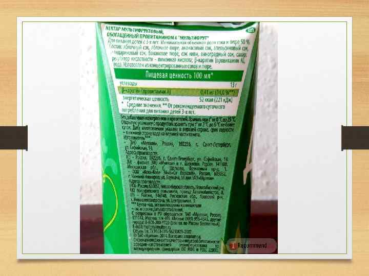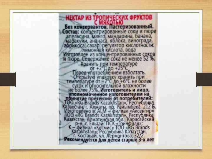 Как делают пакетированный сок? В большинстве случаев пакетированные напитки ( «соки» ) изготавливается по технологии pulp-wash – оставшиеся после прямого отжима остатки апельсина или яблок замачиваются, отстаиваются, затем снова отжимаются, и так несколько раз. В получившуюся жидкость с частичками мякоти добавляется лимонная кислота, ароматизаторы, сахар или глюкозно-фрузктозный сироп. Хорошая новость в том, что производителю все-таки нельзя называть это «соком» , а только «нектаром» или «напитком» .