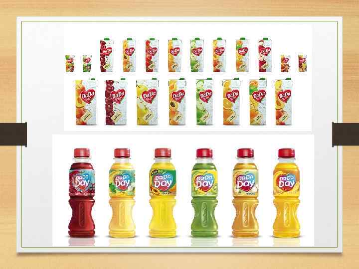 Да-Да-Дэй — одна из самых известных торговых марок в Казахстане. «RG Brands» — Лидирующая компания в сфере напитков и продуктов питания в Казахстане. Основанная в 1994 году, компания «RG Brands» на сегодня имеет 4 производственные площадки на севере и юге Казахстана с общей мощностью 750 миллионов литров в год. «DADA» - наследие компании RG Brands Основан в 1999 году (самый первый бренд компании). Продается более чем в 19 крупнейших городах Казахстана и 9 городах России. Бренд с самым высоким уровнем узнаваемости среди соков и нектаров (99, 5%)*. Семья “Da. Da”: Ø Ø Соки и нектары Da. Da Дача Нектары Da. Da Точно Сочно для детей от 3 -х лет Сокосодержащий напиток Da. Da Day