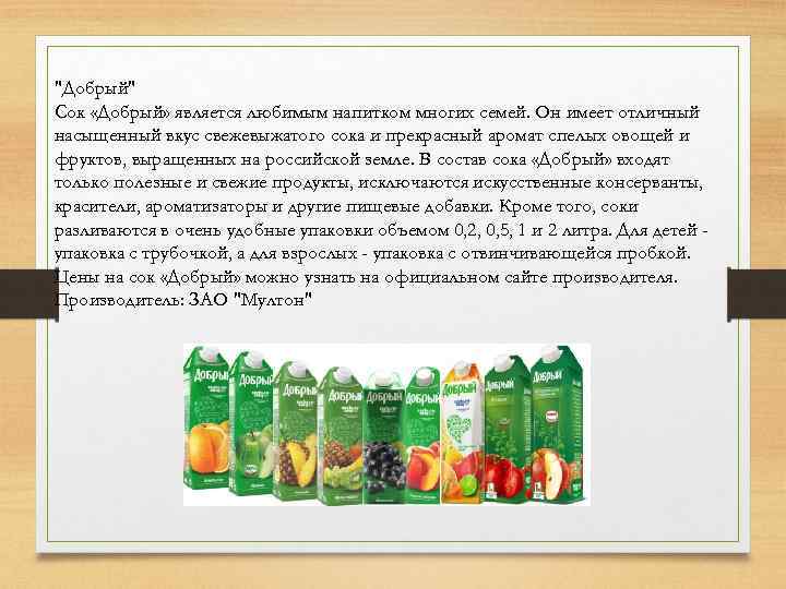 "Добрый" Сок «Добрый» является любимым напитком многих семей. Он имеет отличный насыщенный вкус свежевыжатого сока и прекрасный аромат спелых овощей и фруктов, выращенных на российской земле. В состав сока «Добрый» входят только полезные и свежие продукты, исключаются искусственные консерванты, красители, ароматизаторы и другие пищевые добавки. Кроме того, соки разливаются в очень удобные упаковки объемом 0, 2, 0, 5, 1 и 2 литра. Для детей упаковка с трубочкой, а для взрослых - упаковка с отвинчивающейся пробкой. Цены на сок «Добрый» можно узнать на официальном сайте производителя. Производитель: ЗАО "Мултон"