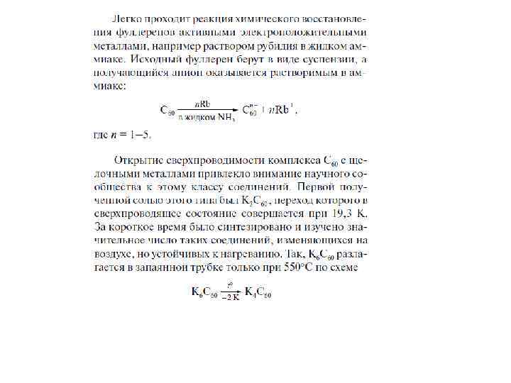 Фуллерен C 70 образует со щелочными металлами ряд фуллеридов с составами MC 70, M 4 C 70 и M 6 C 70. M 3 C 70 со щелочными металлами устойчивы лишь при повышенной температуре, а при охлаждении либо переходит в тригональную фазу, либо диспропорционирует. Однако они могут быть стабилизированы подбором катионов подходящего размера (Na 2 Cs. C 70). Получена также соединение состава Ba 3 C 70. В солях состава M 4 C 70, как и в M 3 C 60, была обнаружена сверхпроводимость. Фуллериды на основе высших фуллеренов менее исследованы. Предельным продуктом допирования C 84 является соль состава K 8+x. C 84, аналогичная по структуре K 6 C 60 и содержащая упорядоченные молекулы фуллерена. Известен также фуллерид с меньшим содержанием металла, K 3 C 84, в котором позиции атомов калия заняты частично и молекулы фуллерена разупорядочены
