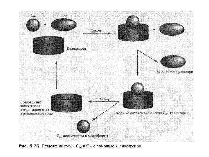 Фуллерены как гости Фуллерены дают соединения включения с ароматическими макроциклами. Действительно, каликсарены, такие, как п-трет-бутилкаликс[8]арен и п-третбутилкаликс[6]арен, можно использовать для выделения фуллеренов С 60 и С 70 из сложной сажевой смеси, образующейся при испарении графита в угольной дуге. В основе этого метода лежит способность больших каликсаренов селективно связывать фуллерены в растворе толуола, в результате чего образуются кристаллические 1: 1 -комплексы п-трет-Бутилка- ликс[8]арен-С 60, а также 1: 2 -комплексы п-трет-бутилкаликс[6]арен(С 60 J и п-трет-бутилкаликс[6]арен-(С 70 J