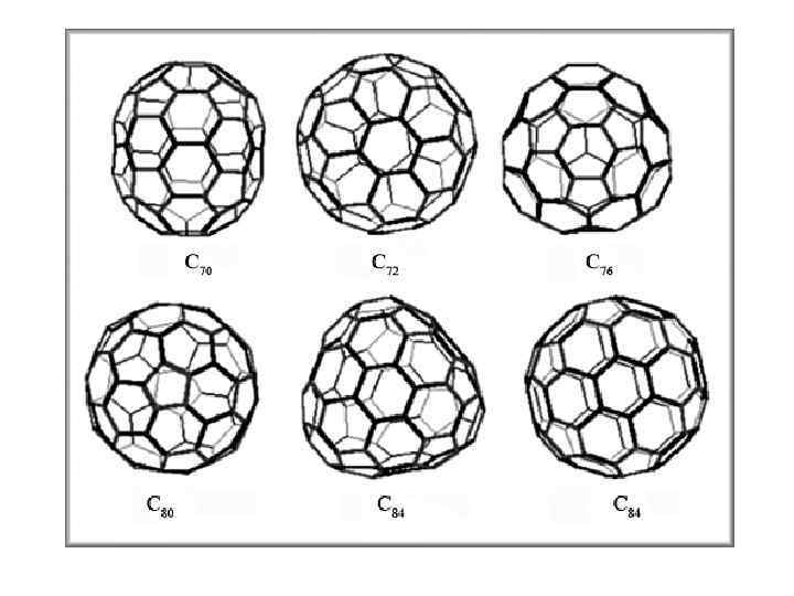 Начиная с C 76, возможны различные изомеры углеродного каркаса, удовлетворяющие IPR Сравнительная стабильность различных фуллеренов широко исследована теоретически методами квантовой химии. Таблица 1. Количество «фуллереновых» полиэдров (M), удовлетворяющих правилу изолированных пятиугольников, в зависимости от числа атомов (n) в углеродном каркасе n 60 62– 68 70 72 74 76 78 80 82 84 86 90 96 M 1 — 1 1 1 2 5 7 9 24 35 46 187