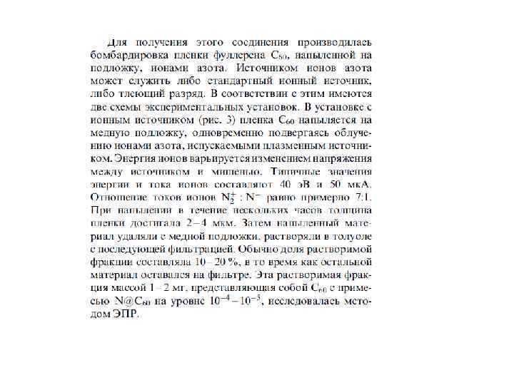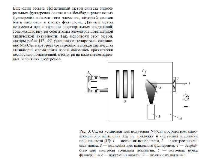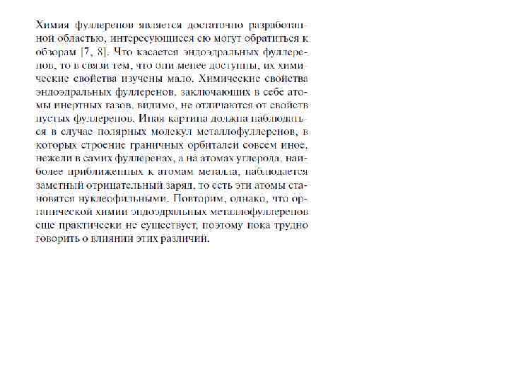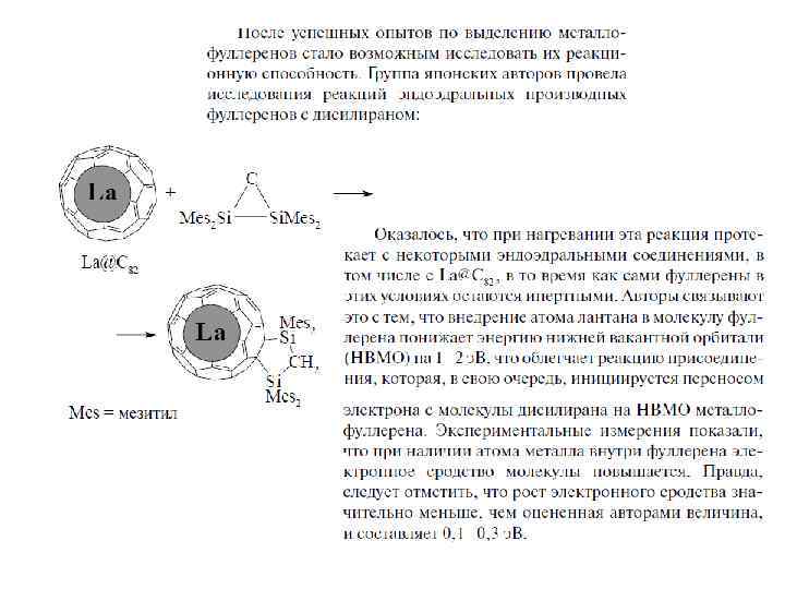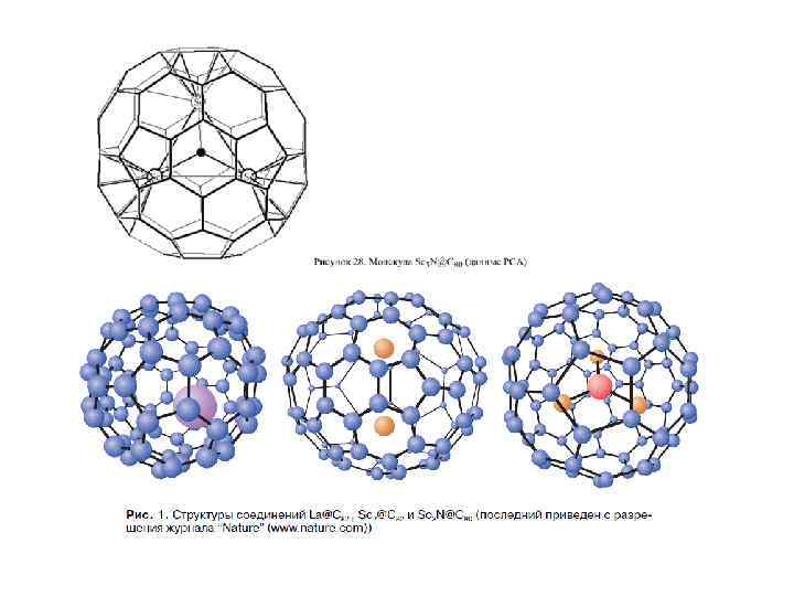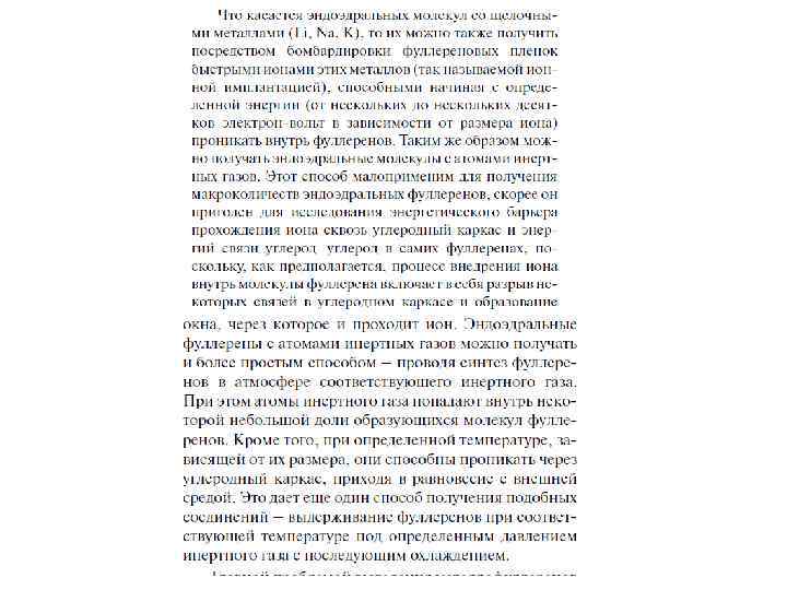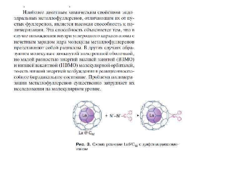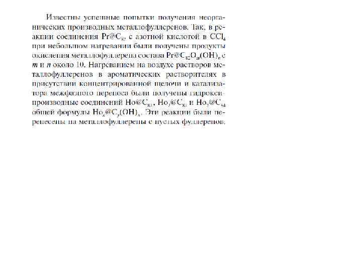 Особое место среди фуллереновых производных занимают эндоэдральные фуллерены, внутри углеродного каркаса которых присутствуют «гости» : атомы металлов или неметаллов (в том числе инертных газов), либо малые кластеры. Эндоэдральные металлофуллерены (ЭМФ) были впервые зафиксированы методом масс-спектрометрии в 1985 г. одновременно с « полыми» фуллеренами и выделены в микрограммовых количествах в 1991 г. Однако их структурные исследования затруднены высокой реакционной способностью и наличием изомеров (см. ниже). Нагревание фуллеренов Cn в атмосфере инертного газа A под давлением позволяет получить примесные количества эндоэдральных производных A@Cn. Соединения C 60 с 3 He и 129 Xe охарактеризованы спектрами ЯМР. Комплекс с гелием теряет гелий при н. у. примерно за 90 мсек. Для C 70 этим методом были также получены соединения A 2@C 70 (A = He и Ne ) с двумя атомами инертных газов в полости фуллеренового каркаса. Соотношение продуктов A@C 70 и A 2@C 70 указывает на «классический» механизм реакции синтеза, включающий разрыв связи С-С с последующим замыканием углеродной клетки. Соединения X@C 60 (где X = Li , N и P ) получены ионной бомбардировкой пленки C 60 в вакууме и охарактеризованы ЭПР-спектрами.