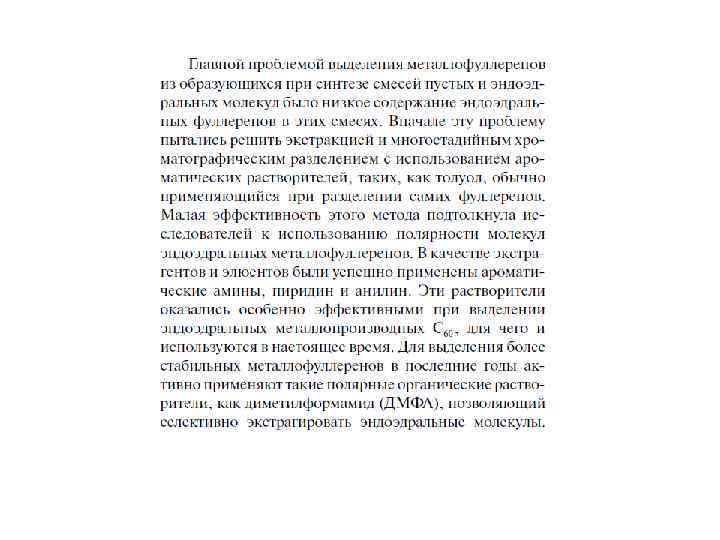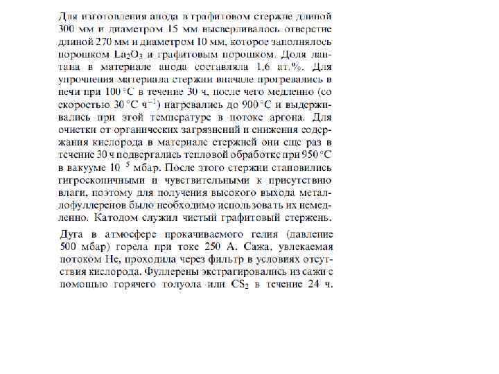 Обычным методом синтеза эндоэдральных металлофуллеренов является плазменная перегонка графита с примесью оксида соответствующего металла (1– 2 ат. %) в атмосфере Не (10– 100 торр). В масс-спектрах продуктов перегонки, наряду с C 60+ и C 70+, присутствуют ионы MCn+ (где n = 60– 100) с преобладанием MC 60+ и MC 82+. Экстракция полярными органическими растворителями либо CS 2 с последующим хроматографическим разделением позволяет получить преимущественно M@C 82, M@C 84 и M 2@C 80, умеренно устойчивые на воздухе, тогда как индивидуальные M@C 60 труднее выделить ввиду их высокой реакционной способности. В настоящее время получены ЭМФ свыше 20 металлов, преимущественно лантаноидов (Ln), в количествах до нескольких миллиграммов.
