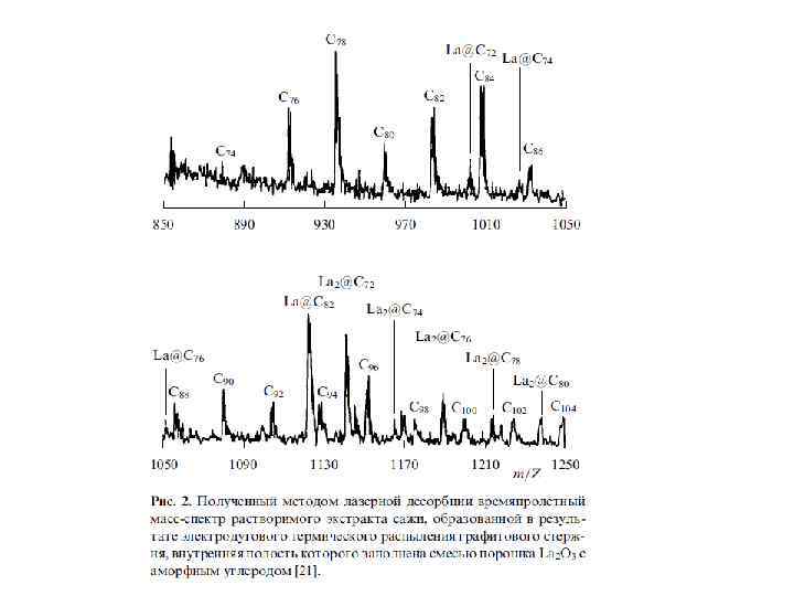 Возможность существования сферической формы углерода была теоретически доказана еще в 1970 -х гг. Обнаружены молекулы C 60 были в 1985 г. английским ученым Г. Крото с коллегами в плазме, образовавшейся при лазерном испарении графита. В их экспериментах лазерный луч направляли на графитовую мишень в форме диска, находящуюся в печи при температуре 1200 °С. Образующиеся пары углерода уносились потоком гелия и осаждались на стенках камеры. Анализ продуктов осаждения, проведенный с помощью масс-спектрометрии, показал, что в них содержатся вещества с молекулярной массой 720 и 840 (рис. 7). Это и были первые фуллерены – C 60 и C 70.