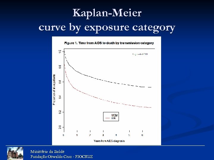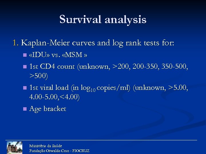 Survival analysis 1. Kaplan-Meier curves and log rank tests for: «IDU» vs. «MSM » n 1 st CD 4 count (unknown, >200, 200 -350, 350 -500, >500) n 1 st viral load (in log 10 copies/ml) (unknown, >5. 00, 4. 00 -5. 00, <4. 00) n Age bracket n Ministério da Saúde Fundação Oswaldo Cruz - FIOCRUZ