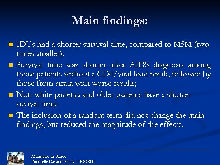 Main findings: n n IDUs had a shorter survival time, compared to MSM (two times smaller); Survival time was shorter after AIDS diagnosis among those patients without a CD 4/viral load result, followed by those from strata with worse results; Non-white patients and older patients have a shorter suvival time; The inclusion of a random term did not change the main findings, but reduced the magnitude of the effects. Ministério da Saúde Fundação Oswaldo Cruz - FIOCRUZ