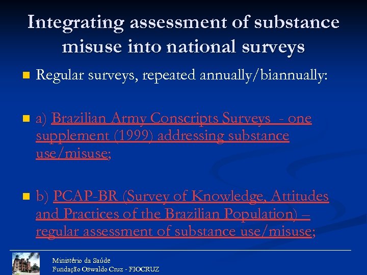 Integrating assessment of substance misuse into national surveys n Regular surveys, repeated annually/biannually: n a) Brazilian Army Conscripts Surveys - one supplement (1999) addressing substance use/misuse; n b) PCAP-BR (Survey of Knowledge, Attitudes and Practices of the Brazilian Population) – regular assessment of substance use/misuse; Ministério da Saúde Fundação Oswaldo Cruz - FIOCRUZ