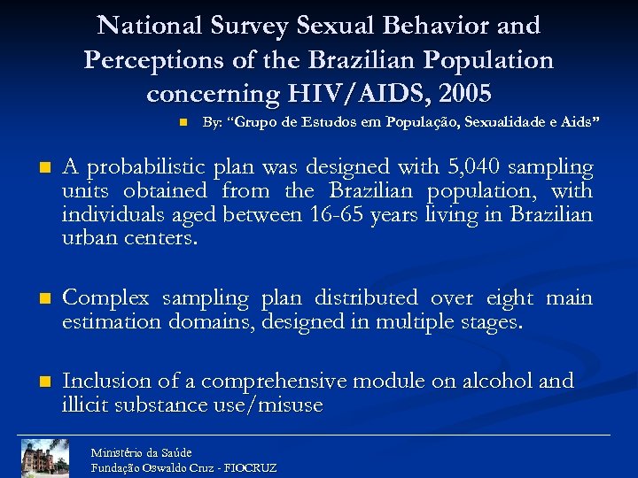 National Survey Sexual Behavior and Perceptions of the Brazilian Population concerning HIV/AIDS, 2005 n By: “Grupo de Estudos em População, Sexualidade e Aids” “ n A probabilistic plan was designed with 5, 040 sampling units obtained from the Brazilian population, with individuals aged between 16 -65 years living in Brazilian urban centers. n Complex sampling plan distributed over eight main estimation domains, designed in multiple stages. n Inclusion of a comprehensive module on alcohol and illicit substance use/misuse Ministério da Saúde Fundação Oswaldo Cruz - FIOCRUZ