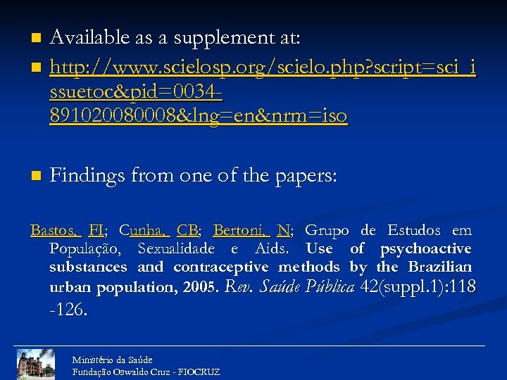 Available as a supplement at: n http: //www. scielosp. org/scielo. php? script=sci_i ssuetoc&pid=0034891020080008&lng=en&nrm=iso n n Findings from one of the papers: Bastos, FI; Cunha, CB; Bertoni, N; Grupo de Estudos em População, Sexualidade e Aids. Use of psychoactive substances and contraceptive methods by the Brazilian urban population, 2005. Rev. Saúde Pública 42(suppl. 1): 118 -126. Ministério da Saúde Fundação Oswaldo Cruz - FIOCRUZ