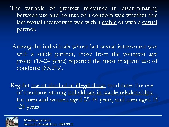 The variable of greatest relevance in discriminating between use and nonuse of a condom was whether this last sexual intercourse was with a stable or with a casual partner. Among the individuals whose last sexual intercourse was with a stable partner, those from the youngest age group (16 -24 years) reported the most frequent use of condoms (85. 0%). Regular use of alcohol or illegal drugs modulates the use of condoms among individuals in stable relationships, for men and women aged 25 -44 years, and men aged 16 -24 years. Ministério da Saúde Fundação Oswaldo Cruz - FIOCRUZ