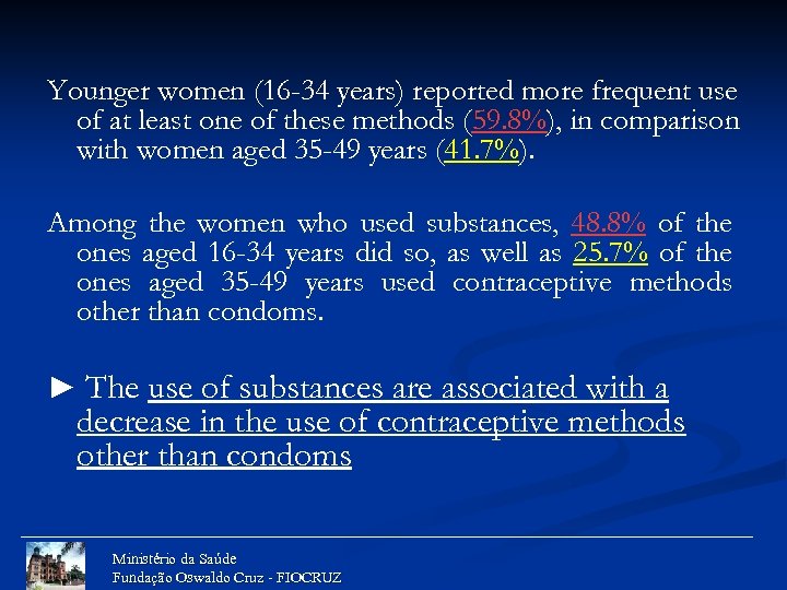 Younger women (16 -34 years) reported more frequent use of at least one of these methods (59. 8%), in comparison with women aged 35 -49 years (41. 7%). Among the women who used substances, 48. 8% of the ones aged 16 -34 years did so, as well as 25. 7% of the ones aged 35 -49 years used contraceptive methods other than condoms. ► The use of substances are associated with a decrease in the use of contraceptive methods other than condoms Ministério da Saúde Fundação Oswaldo Cruz - FIOCRUZ