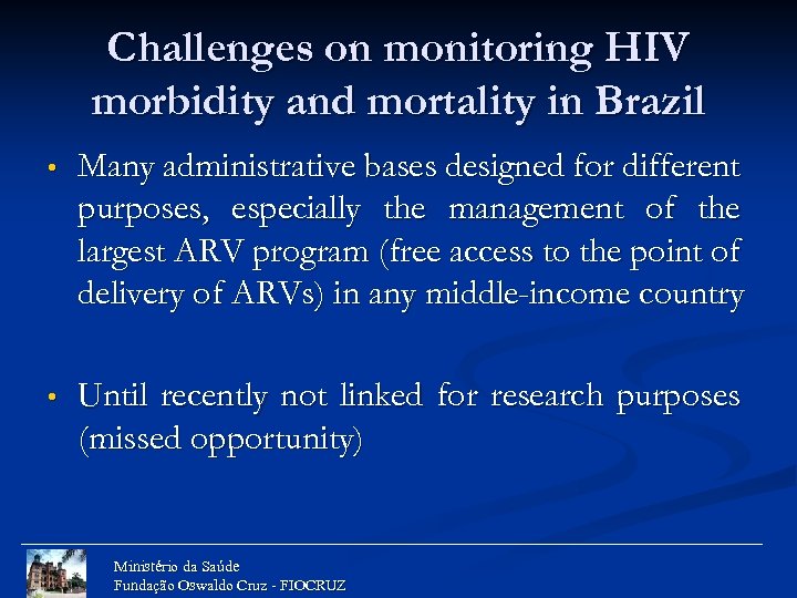 Challenges on monitoring HIV morbidity and mortality in Brazil • Many administrative bases designed for different purposes, especially the management of the largest ARV program (free access to the point of delivery of ARVs) in any middle-income country • Until recently not linked for research purposes (missed opportunity) Ministério da Saúde Fundação Oswaldo Cruz - FIOCRUZ