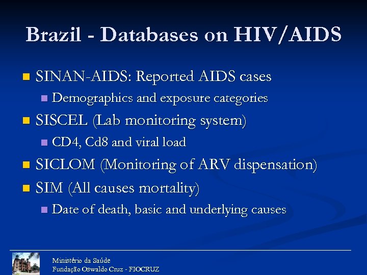 Brazil - Databases on HIV/AIDS n SINAN-AIDS: Reported AIDS cases n n Demographics and exposure categories SISCEL (Lab monitoring system) n CD 4, Cd 8 and viral load SICLOM (Monitoring of ARV dispensation) n SIM (All causes mortality) n n Date of death, basic and underlying causes Ministério da Saúde Fundação Oswaldo Cruz - FIOCRUZ