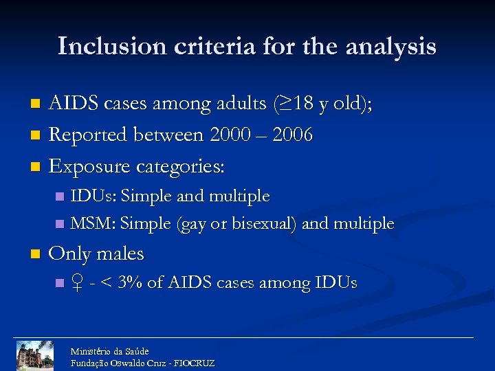 Inclusion criteria for the analysis AIDS cases among adults (≥ 18 y old); n Reported between 2000 – 2006 n Exposure categories: n IDUs: Simple and multiple n MSM: Simple (gay or bisexual) and multiple n n Only males n ♀ - < 3% of AIDS cases among IDUs Ministério da Saúde Fundação Oswaldo Cruz - FIOCRUZ