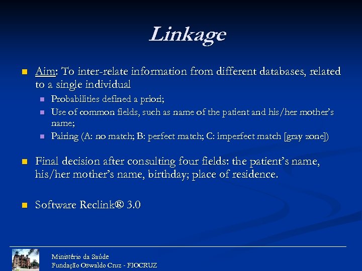 Linkage n Aim: To inter-relate information from different databases, related to a single individual n n n Probabilities defined a priori; Use of common fields, such as name of the patient and his/her mother’s name; Pairing (A: no match; B: perfect match; C: imperfect match [gray zone]) n Final decision after consulting four fields: the patient’s name, his/her mother’s name, birthday; place of residence. n Software Reclink® 3. 0 Ministério da Saúde Fundação Oswaldo Cruz - FIOCRUZ