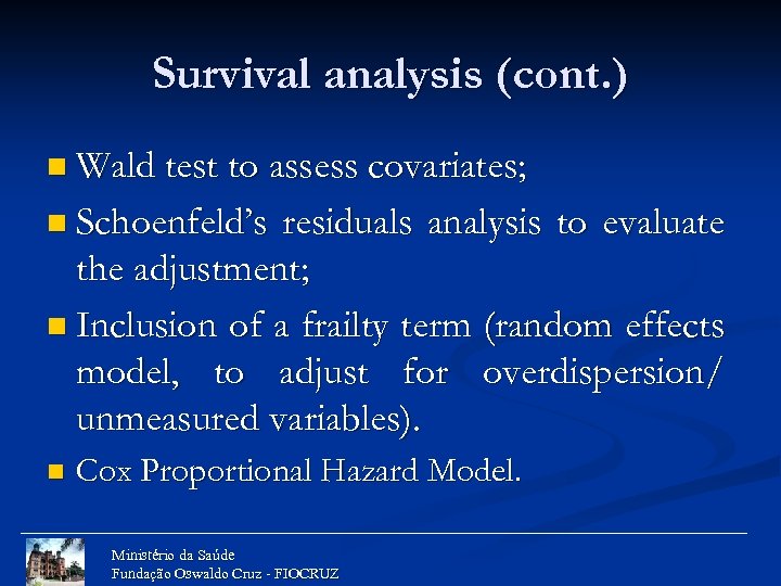 Survival analysis (cont. ) n Wald test to assess covariates; n Schoenfeld’s residuals analysis to evaluate the adjustment; n Inclusion of a frailty term (random effects model, to adjust for overdispersion/ unmeasured variables). n Cox Proportional Hazard Model. Ministério da Saúde Fundação Oswaldo Cruz - FIOCRUZ