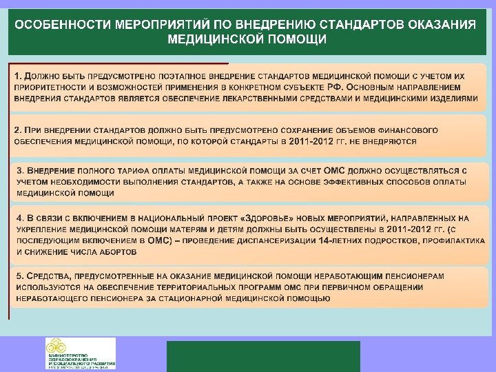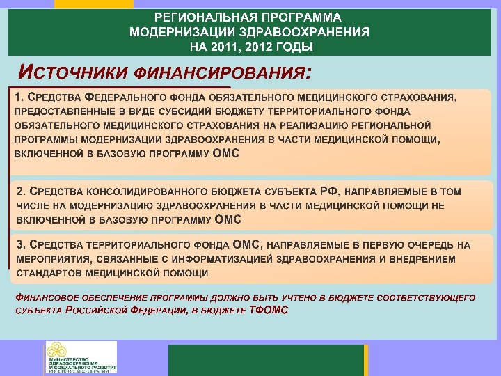 Организация системы одноканального финансирования в лице ОМС Плюсы: • Упрощение системы финансирования программы госгарантий • Большая прозрачность финансовых потоков • Повышение эффективности управления финансированием • Максимальная персонификация ответственности Риски: • Недостаток средств на реализацию госгарантий в одном источнике • Снижение ответственности региональных центров Пути решения: • Регулирование отчислений из консолидированных бюджетов регионов • Определить федеральный бюджет, как источник покрытия дефицита программы госгарантий