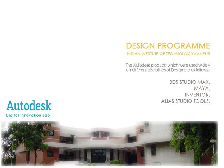 Facilities - Software Auto. CAD 2008 Autodesk 3 ds Max 9 Revit Architecture 2008 Revit MEP 2008 Revit Structure 2008 Autodesk Inventor 2008 Autodesk Map Guide Enterprise 2008 Autodesk Map Guide Studio 2008 Auto. CAD Electrical 2008 Civil 3 D 2008 Map 3 D 2008 Maya Complete 8. 5 Alias Studio Tools 2008 Image Studio 2008 Portfolio Wall 2008 Raster Design 2008 Product stream 2008 Combustion 4 Cleaner XL 1. 5 Autodesk Data Management AOEM Viewer 2008 Autodesk Design Review Autodesk DWF Viewer Backburner