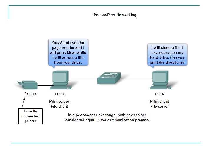 Peer To Peer Model n Peer-to-peer network terbagi menjadi 2 bentuk : peer-to-peer network design dan peer-topeer application n Pada jaringan peer-to-peer, 2 atau lebih komputer dihubungkan melalui jaringan dapat berbagi resource (seperti printer dan file) tanpa memiliki server yang dedicated. Setiap koneksi dan device (yang dikenal sebagai peer) dapat berfungsi sebagai client atau server. 1 komputer dapat diasumsikan sebagai server untuk 1 transaksi sekaligus berperan sebagai client bagi yang lain. Tugas client dan server diatur dengan basis per request. n Sebuah simple home network dengan 2 komputer yang terkoneksi dengan printer adalah contoh jaringan peer-to-peer. Masing-masing orang dapat mengatur PC nya masing agar dapat men-share file, bermain game online, atau menshare koneksi internet. Contoh lainnya adalah 2 komputer yang terkoneksi suatu jaringan yang menggunakan software aplikasi untuk menshare resource satu sama lain melalui jaringan. n Tidak seperti model client/ server yang menggunakan server yang dedicated, peer-to-peer network melakukan desentralisasi resource di jaringan. Informasi dapat diletakkan dimanapun pada device yang terkoneksi. Hampir semua OS sekarang ini support file dan print sharing tanpa perlu software tambahan lagi. Karena peer-to-peer network biasanya tidak menggunakan akun user, izin, atau monitor secara sentralisasi, maka akan sulit untuk melindungi security dan access policies dalam jaringan yang memiliki banyak komputer. User akun dan akses harus di set secara individual per peer device.