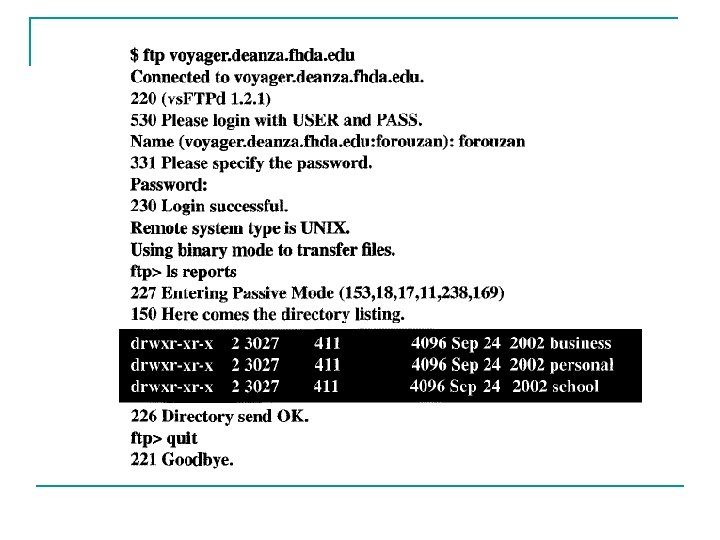FTP (File Transfer Protocol) n n Untuk keperluan sharing data Mengakomodasi keperluan remote computer Melindungi user dari sistem penyimpanan data yang bervariasi antara host yang berbeda. Mentransfer data secara efisien.