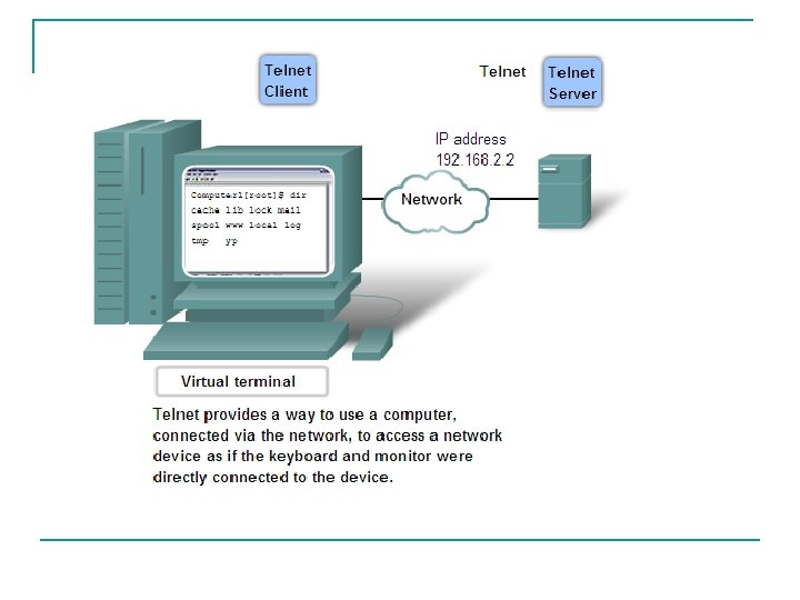 TELNET n Jauh sebelum PC dengan interface grafik ada, orang menggunakan sistem yang text-based dimana display terminal langsung terhubung ke komputer sentral. Setelah adanya jaringan, orang membutuhkan cara untuk melakukan remote access ke sistem komputer. n Telnet dikembangkan tahun 1970, menyediakan metode standar emulasi perangkat terminal text-based melalui jaringan data. Protokol dan software client, keduanya biasa disebut Telnet. n Koneksi menggunakan Telnet disebut sesi atau koneksi Virtual Terminal. Telnet menggunakan software untuk membentuk virtual device yang menyediakan fitur yang sama pada terminal session dengan akses ke CLI (command Line Interface) server.