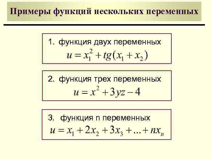 Примеры функций нескольких переменных 1. функция двух переменных 2. функция трех переменных 3. функция n переменных