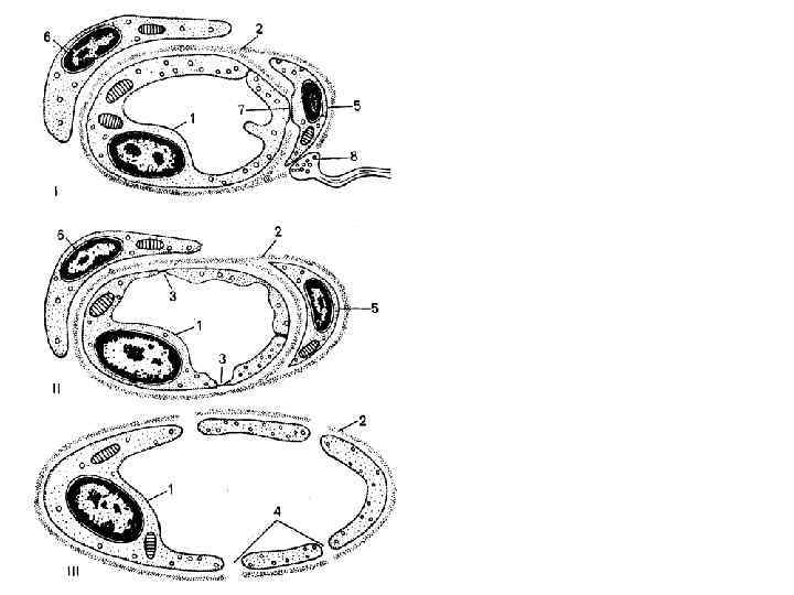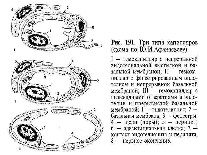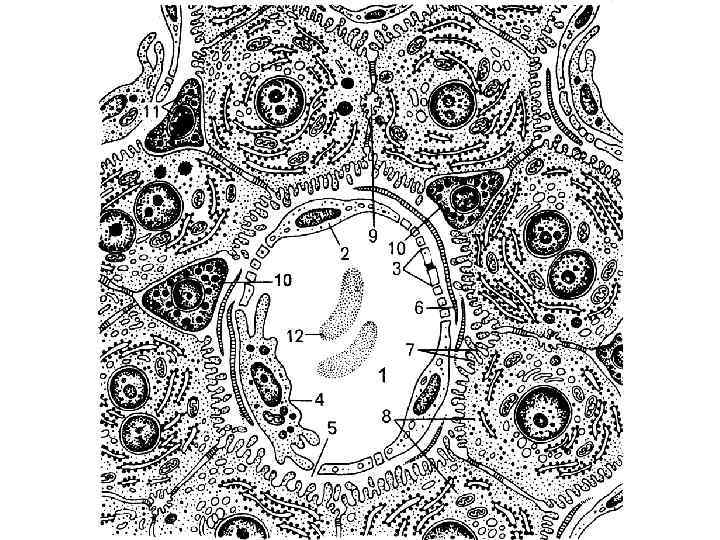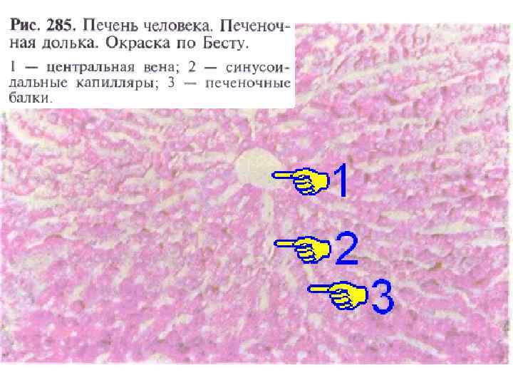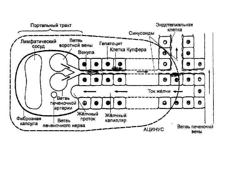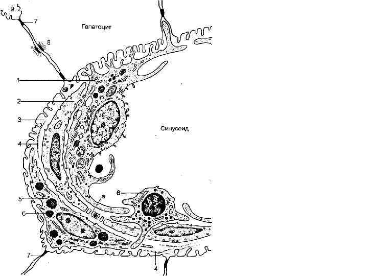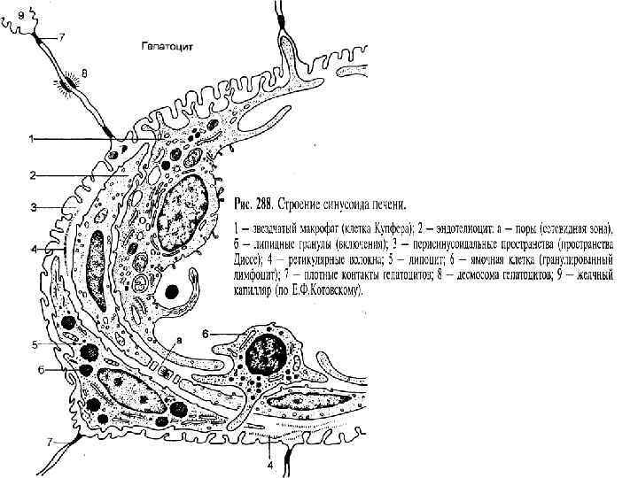 Строение балок печени (по Е. Ф. Котовскому) 1 — печеночная балка (пластинка); 2 — гепатоцит; 3 — кровеносные капилляры; 4 — перисинусоидальное пространство; 5 — перисинусоидальный липоцит; 6 — желчный каналец; 7 а — вокругдольковая вена; 7 б — вокругдольковая артерия; 7 в — вокругдольковый желчный проток; 8 — центральная вена.