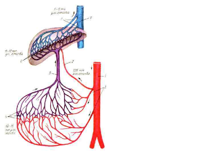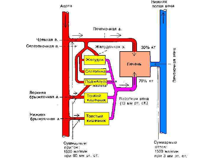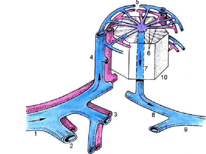 Воротная система печени 1. 2. 3. 4. 5. Нижняя полая вена Печёночные вены Вены от желудка Вены от кишечника Вены от тонкого и толстого кишечник 6. Воротная вена