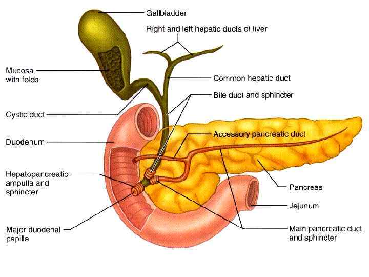 Строение sphincter Oddi при фронтальном рассечении большого соска двенадцатиперстной кишки 1 — общий желчный проток; 2 — мышечный жом желчного протока; 3 — поджелудочный проток; 4 — мышечный жом поджелудочного протока; 5 — стенка двенадцатиперстной кишки; 6 — общий мышечный жом печеночно-поджелудочной ампулы.