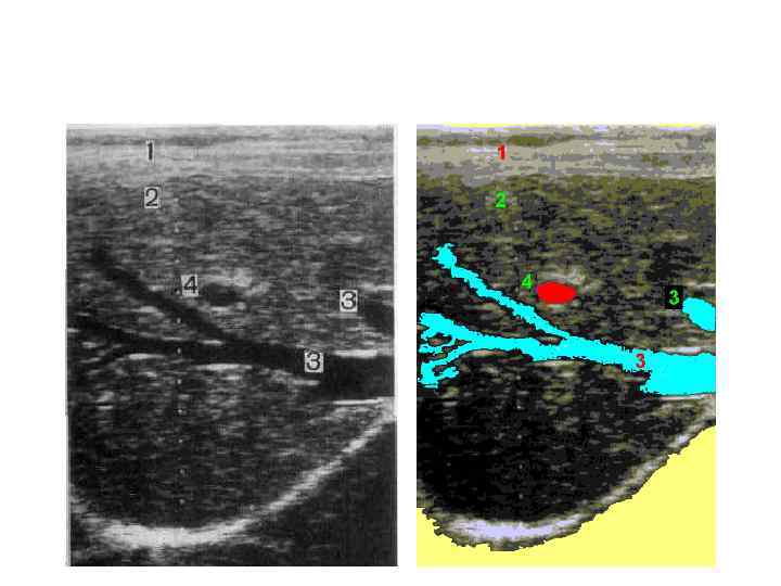 Сонограмма печени здорового человека. 1 — передняя брюшная стенка; 2 — правая доля печени; 3 — печеночные вены; 4 — ветвь воротной вены.