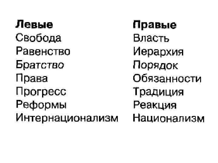 По социально-экономической ориентации, т. е. по отношению к формам собственности и способам распределения общественных благ партии делятся на три основные группы: • партии консервативного типа (правые), • партии центристского типа, • партии левого типа.