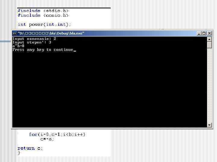 Реализация. Тело функции - это составной оператор, содержащий операторы, определяющие действие функции. <тип возвращаемого значения> <имя функции>(<список аргументов>) { <объявления локальных переменных и операторы> } Точка с запятой после правой круглой скобки, закрывающий список параметров в описании функции, является синтаксической ошибкой. Повторное определение параметра функции как локальной переменной этой функции является синтаксической ошибкой.