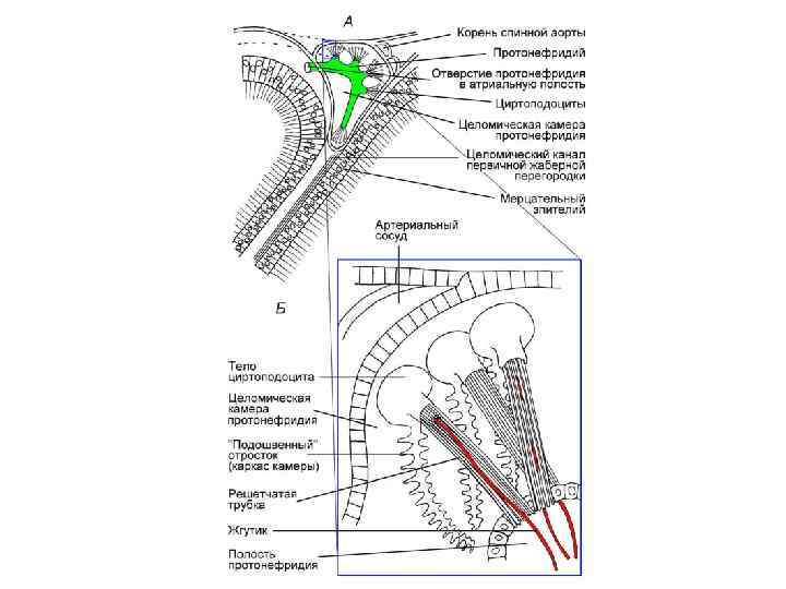 Выделительная система ланцетника соленоциты отверстие в атриальную полость отверстия в полость тела ножка соленоцита с каналом внутри мерцательный волосок жаберная щель Соленоциты (циртоподоциты) - направление движения продуктов распада