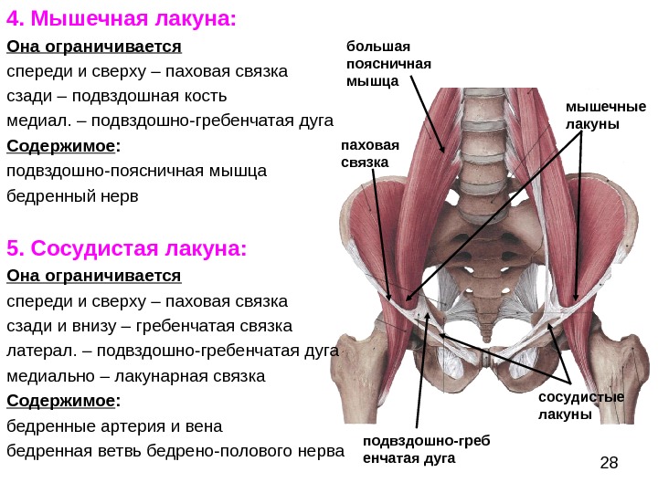 284. Мышечная лакуна: Она ограничивается спереди и сверху – паховая связка сзади – подвздошная кость медиал. – подвздошно-гребенчатая дуга Содержимое : подвздошно-поясничная мышца бедренный нерв 5. Сосудистая лакуна: Она ограничивается спереди и сверху – паховая связка сзади и внизу – гребенчатая связка латерал. – подвздошно-гребенчатая дуга медиально – лакунарная связка Содержимое : бедренные артерия и вена бедренная ветвь бедрено-полового нерва мышечные лакуныбольшая поясничная мышца сосудистые лакуны подвздошно-греб енчатая дугапаховая связка