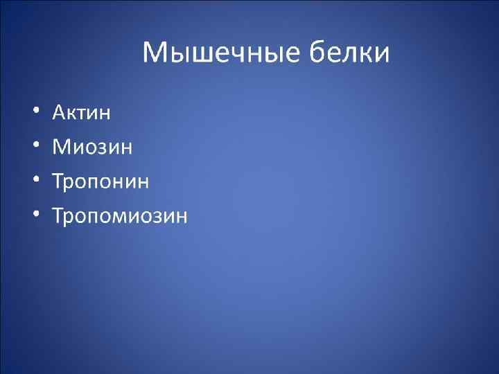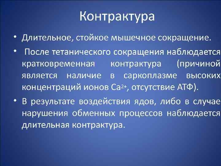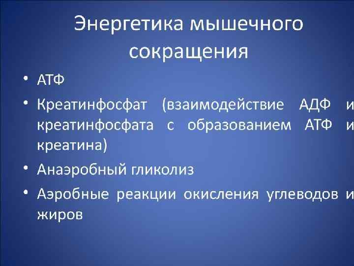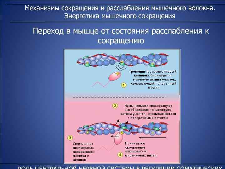Физиология мышечного сокращения Раздражение рецептора – возникновение потенциала действия – проведение его вдоль клеточной мембраны – по Т -системе- выход ионов Ca в саркоплазму– формирование актомиозинового (сократительного ) комплекса (распад АТФ) - скольжение нитей актина и миозина (укорочение) – прекращение возбуждения – распад актомиозинового (сократительного)комплекса (распад АТФ) – «кальциевая помпа» – расслабление.